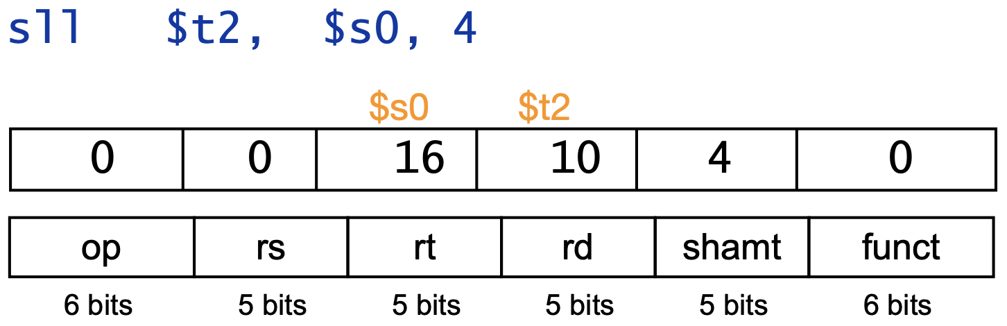 <pre>sll $t2, $s0, 4</pre>는 다음과 같은 machine code로 바뀐다.