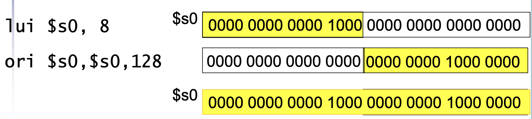 ori $s0, $s0, 128 // $s0의 하단 16개 bit에 128을 넣는다.