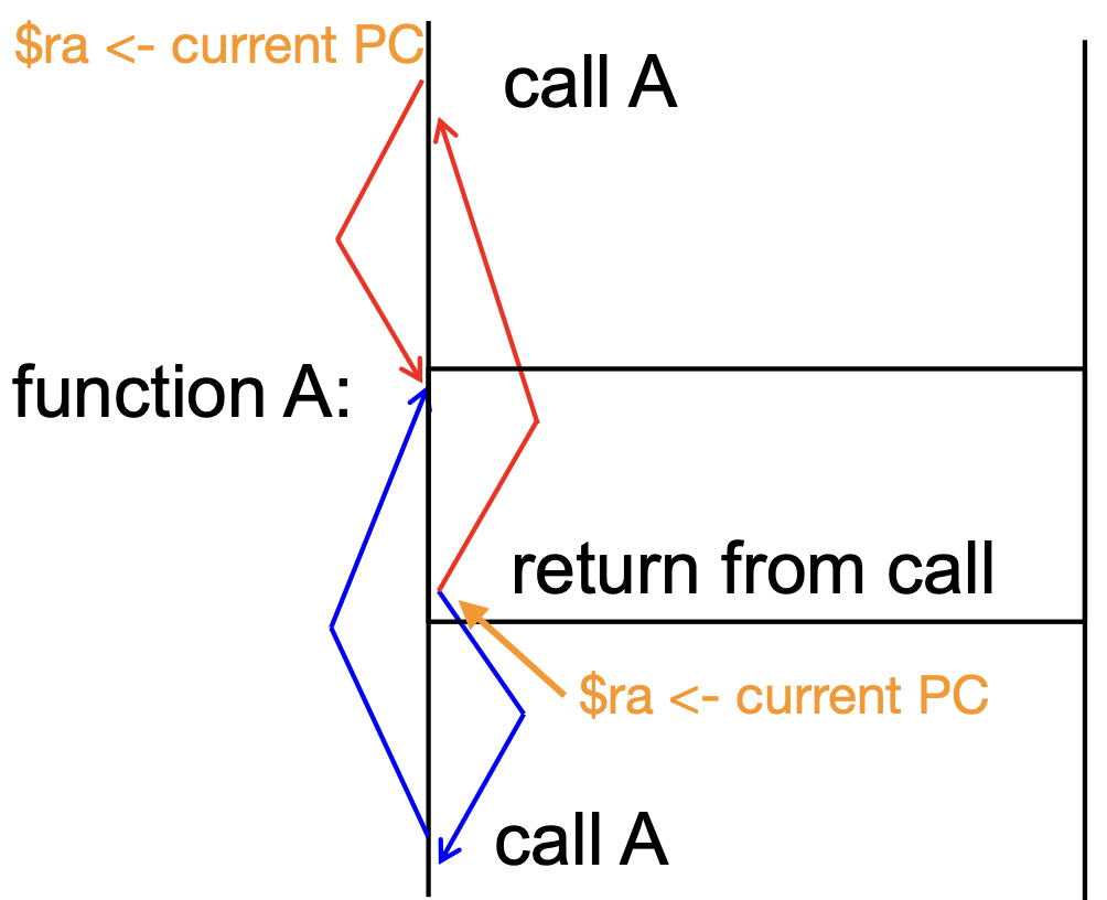 Procedure call 실행 후 return을 위해서, caller는 이동하기 전에 return address를 return address register($ra)에 저장한다.