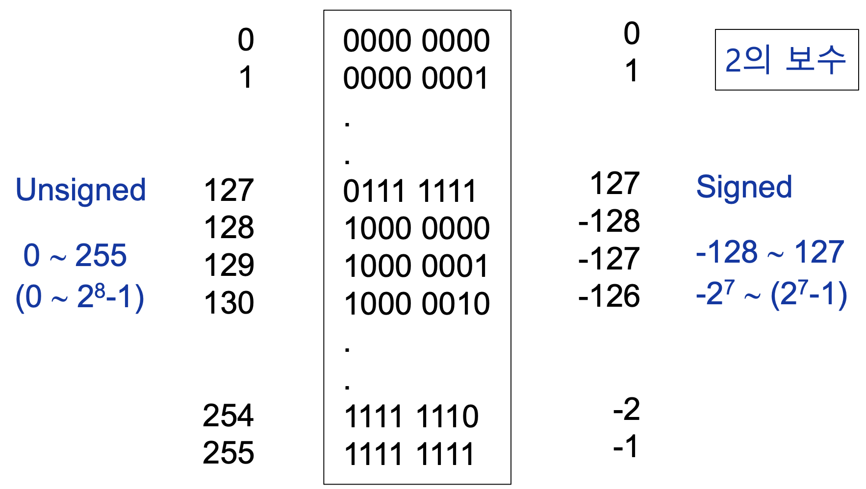 1byte에서 signed number는 -128~127($2^7 - 1$)까지 표현이 가능하다.