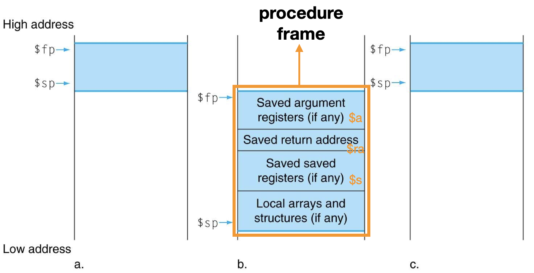 Non-leaf procedure은 runtime stack에 frame을 push/pop 하면서 call/return 된다.