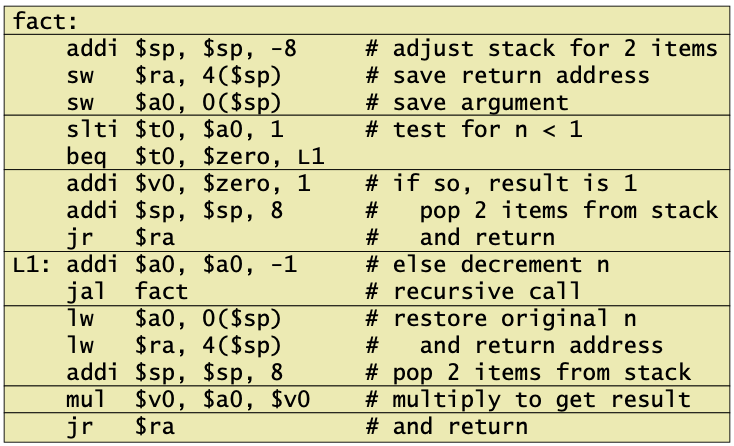 Argument n은 <pre>$a0</pre>을 사용하고, result는 <pre>$v0</pre>에 담긴다.