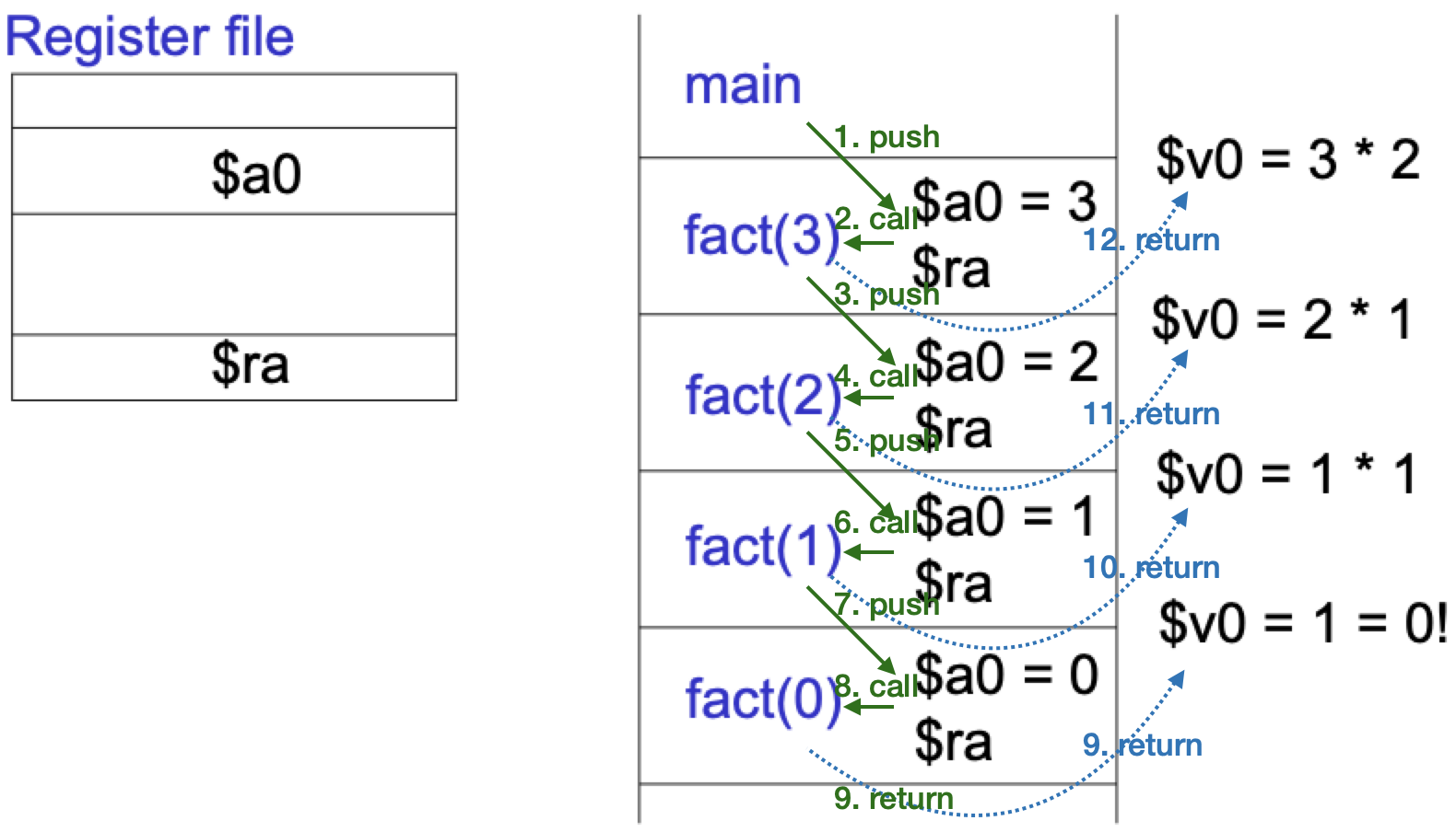 - 다른 procedure을 call하기 전에 자신의 caller에게 받았던 <pre>$a, $ra</pre>을 stack에 저장하고, call이 끝나면 다시 복원해야 한다.