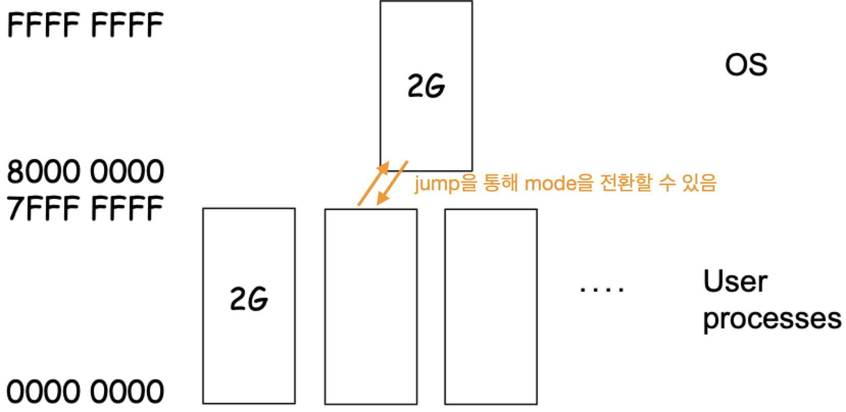 그러나 OS와 user process가 2GB씩 나눠가지고 있으면 단순히 jump을 통해 전환이 가능하다.