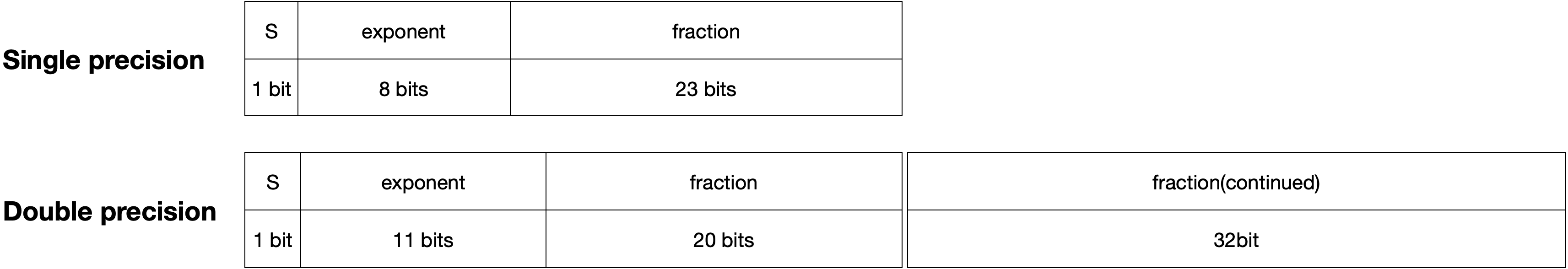 - single precision보다 fraction에 더 많은 bit를 사용하기 때문에 더 정확한 표현이 가능하다.