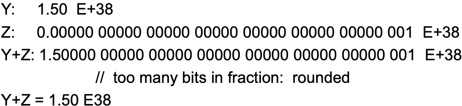 x + (y + z)에서 y + z을 계산한 결과의 fraction이 23bit을 넘어서기 때문이다.