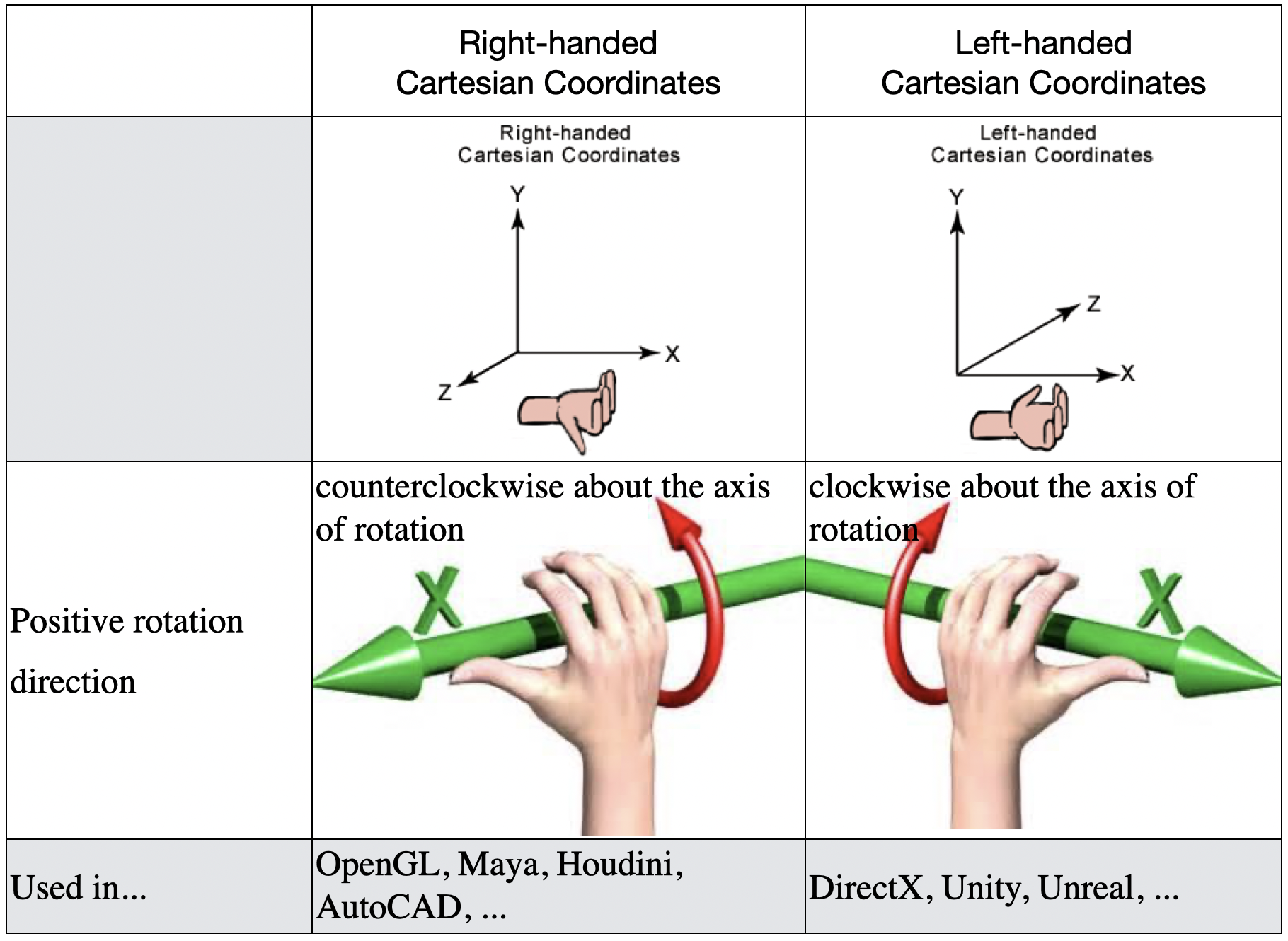 둘 다 사용하고 있으며 앞쪽으로 나와있는 것을 Right-handed cartesian coordinates라고 하고, 뒤쪽으로 빠져있는 것을 Left-handed cartesian coordinates라고 한다.