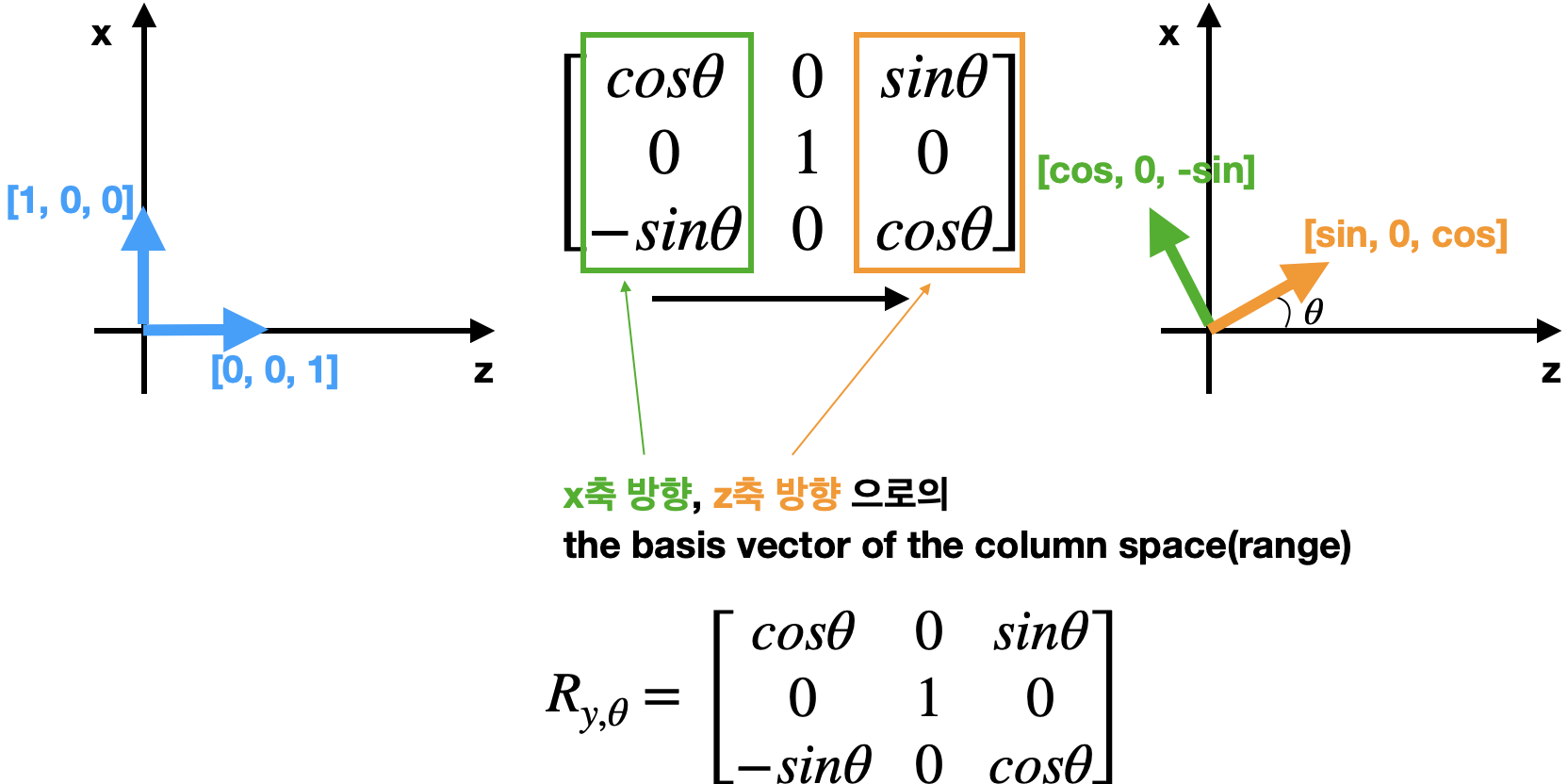 $R_{y, \theta} = \begin{bmatrix} cos\theta & 0 & sin\theta \\ 0 & 1 & 0 \\ -sin\theta & 0 & cos\theta \end{bmatrix}$