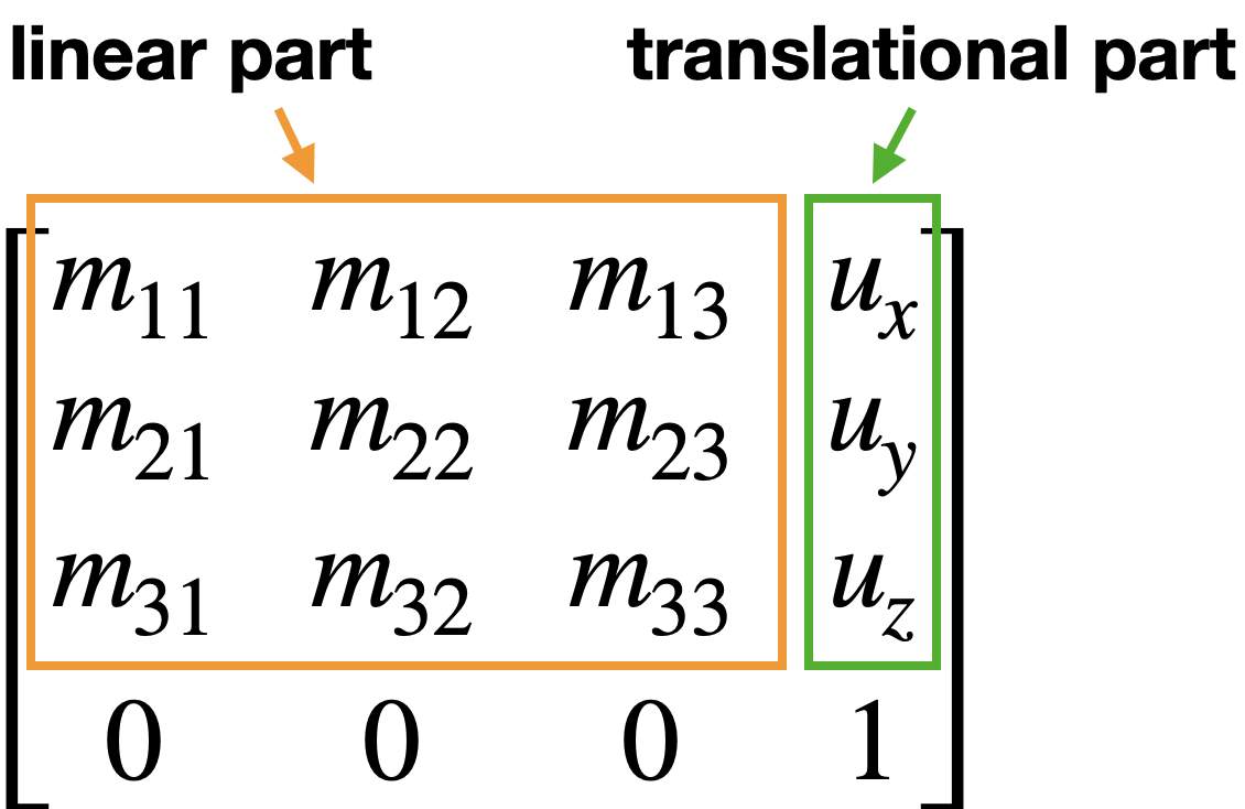 $\begin{bmatrix} 1 & 0 & 0 & u_x \\ 0 & 1 & 0 & u_y \\ 0 & 0 & 1 & u_z \\ 0 & 0 & 0 & 1 \end{bmatrix}$