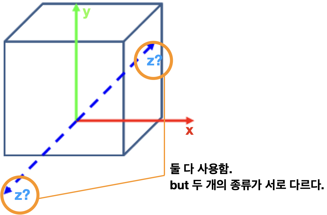그런데 3차원의 경우 z축을 어디로 잡느냐를 결정해야 한다.