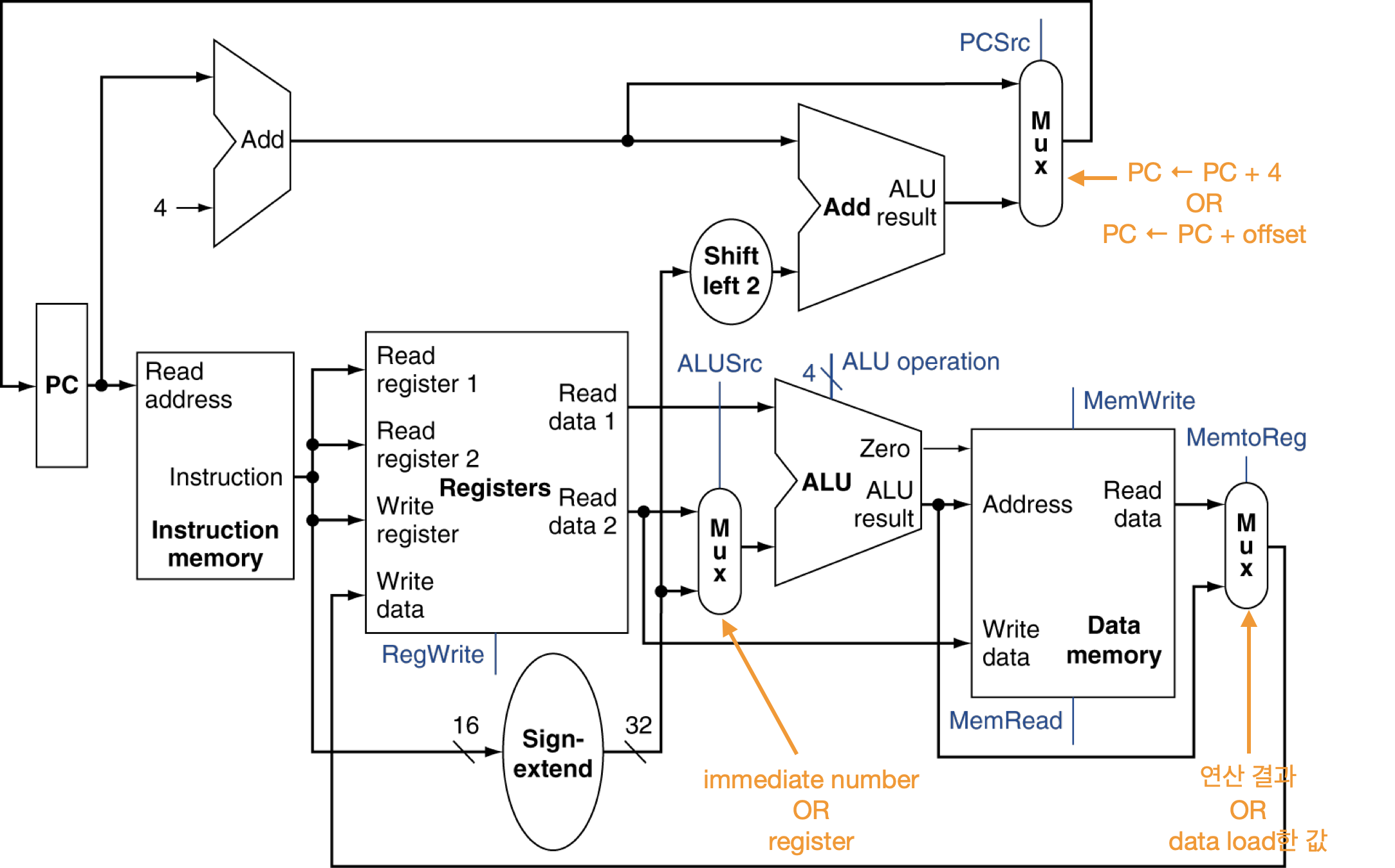 - Branch instruction(beq, bne) 일 때 PC ← PC + offset 혹은 PC ← PC + 4을 넣어준다.