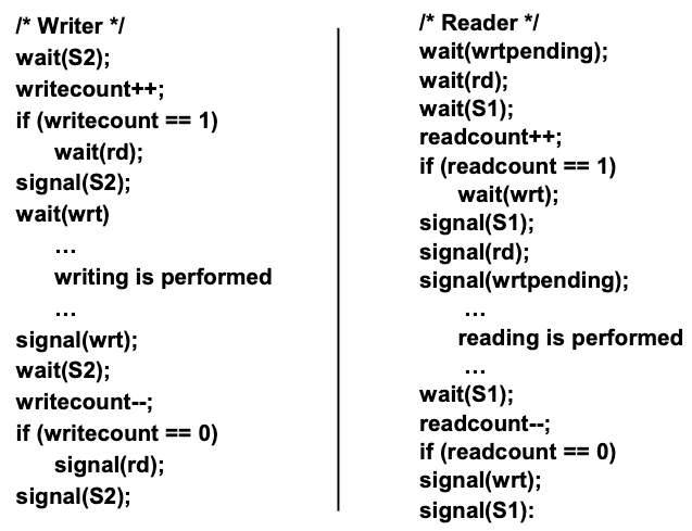 - <pre>Semaphore S1, S2, wrt, rd, wrtpending</pre>