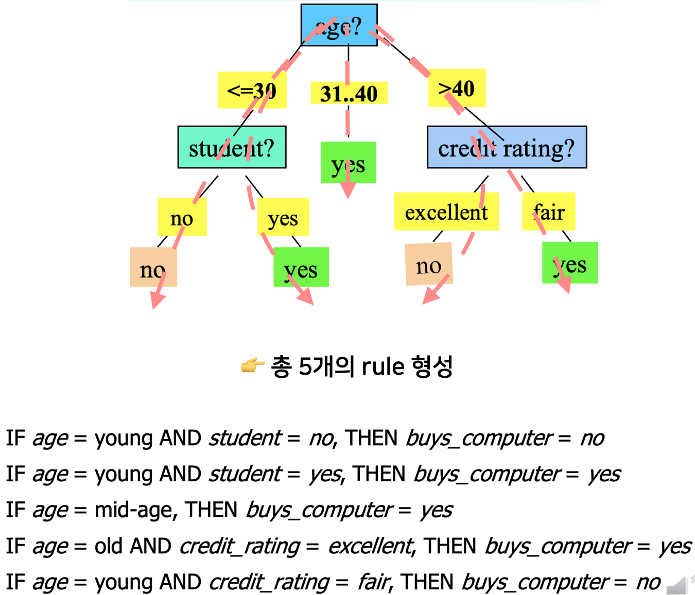 "IF age = youth AND student = yes THEN buys_computer = yes"와 같은 형태이다.