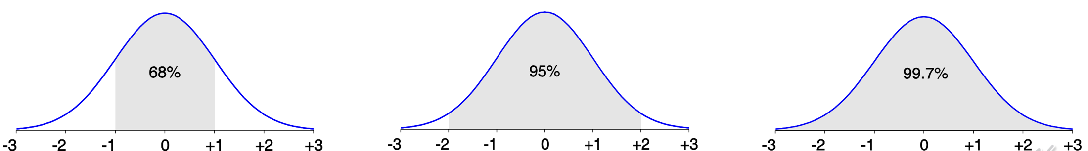 - $\mu - 3\sigma$ ~ $\mu + 3\sigma$ : 데이터의 약 99.7%가 위치한다.