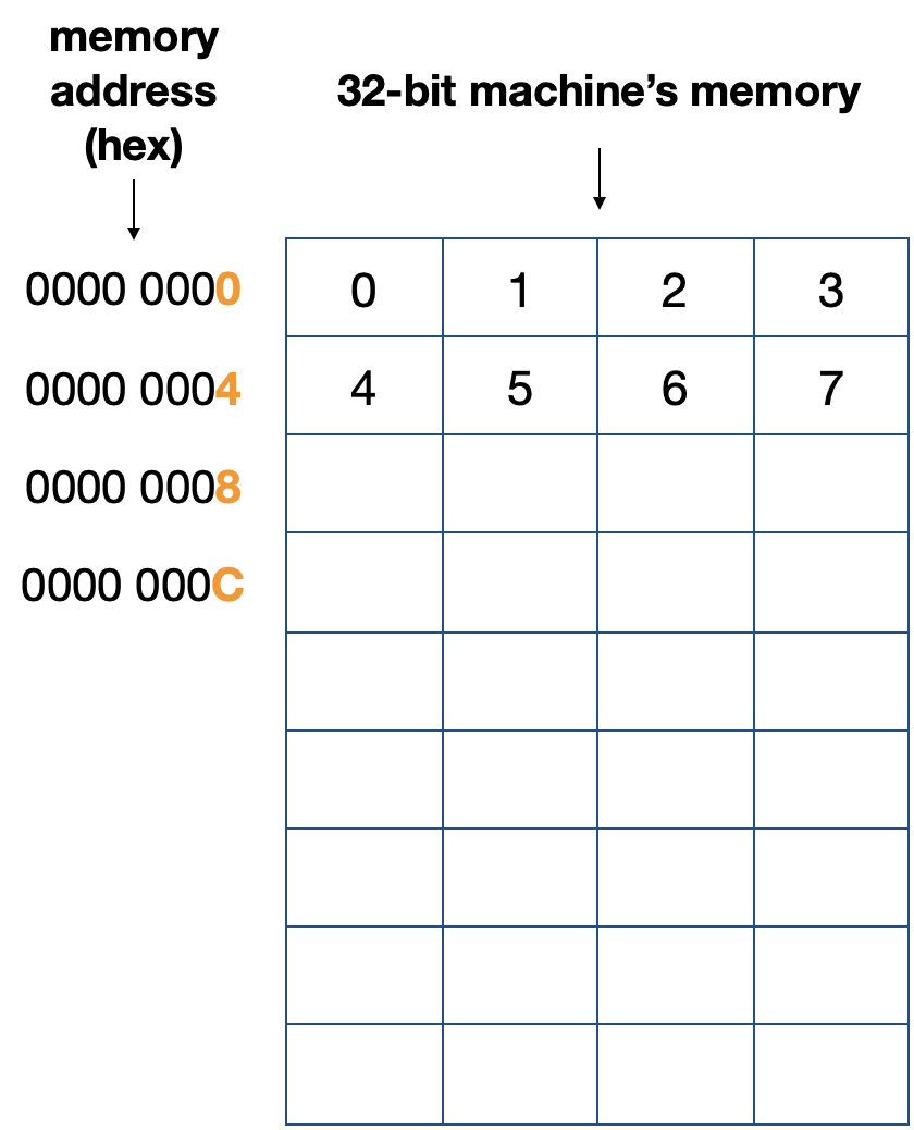 char는 8bit이므로 한칸을 사용하게 되고, 16bit int는 2칸을 묶어서, 32bit int는 4개(즉, 한줄)을 묶어서 사용하게 된다.