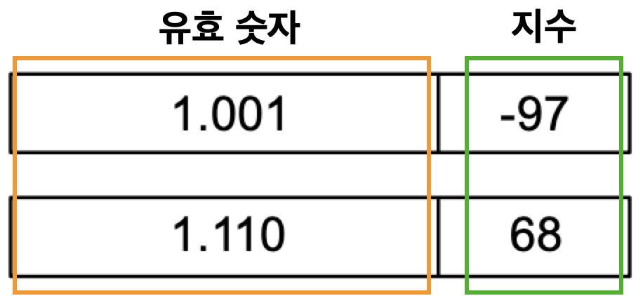 예를 들어 $1.001 \times 2^{-97}, 1.110 \times 2^{68}$는 다음과 같이 표현한다.