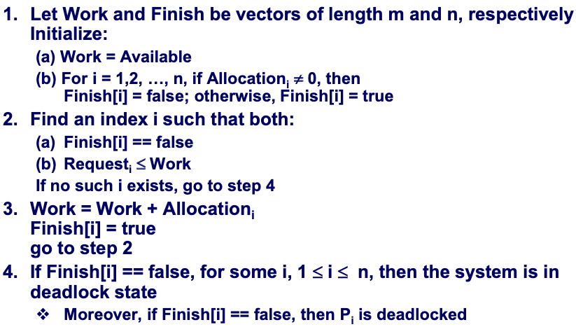- detection algorithm : system의 state가 deadlock이 발생할지를 체크하는 알고리즘