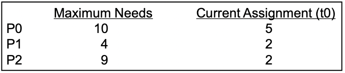 12개의 resource instance가 있고, 3개의 프로세스가 있을 때 다음과 같은 상황이라고 하자.