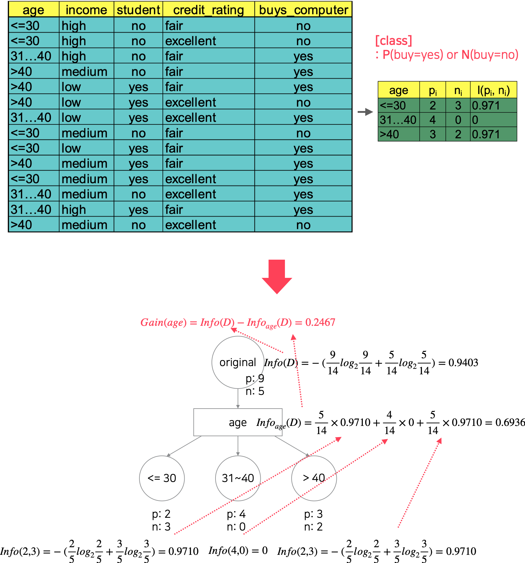 - age : $Info_{age} = 0.6936 \rightarrow Gain(age) = 0.2467$