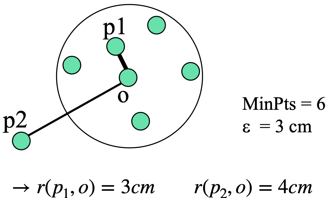 - core distance : 점 o를 core point로 만들어주는 distance의 최솟값을 점 o의 core distance라고 한다.