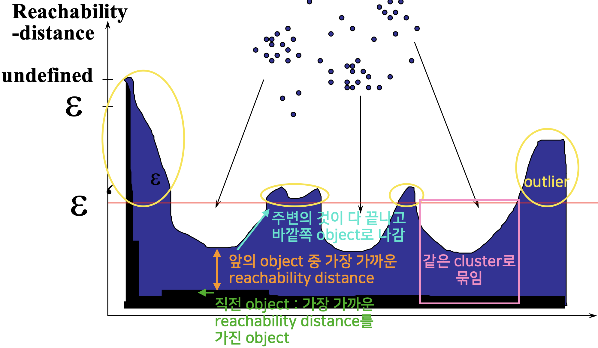 즉, reachability distance가 $\epsilon$보다 큰 object는 버린다.