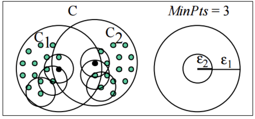 - 아래 그림에서 $Eps = \epsilon _2$을 사용한 clustering은 합쳐지며 추가적인 point가 묶여서 $Eps = \epsilon _1$의 결과가 만들어진다.
