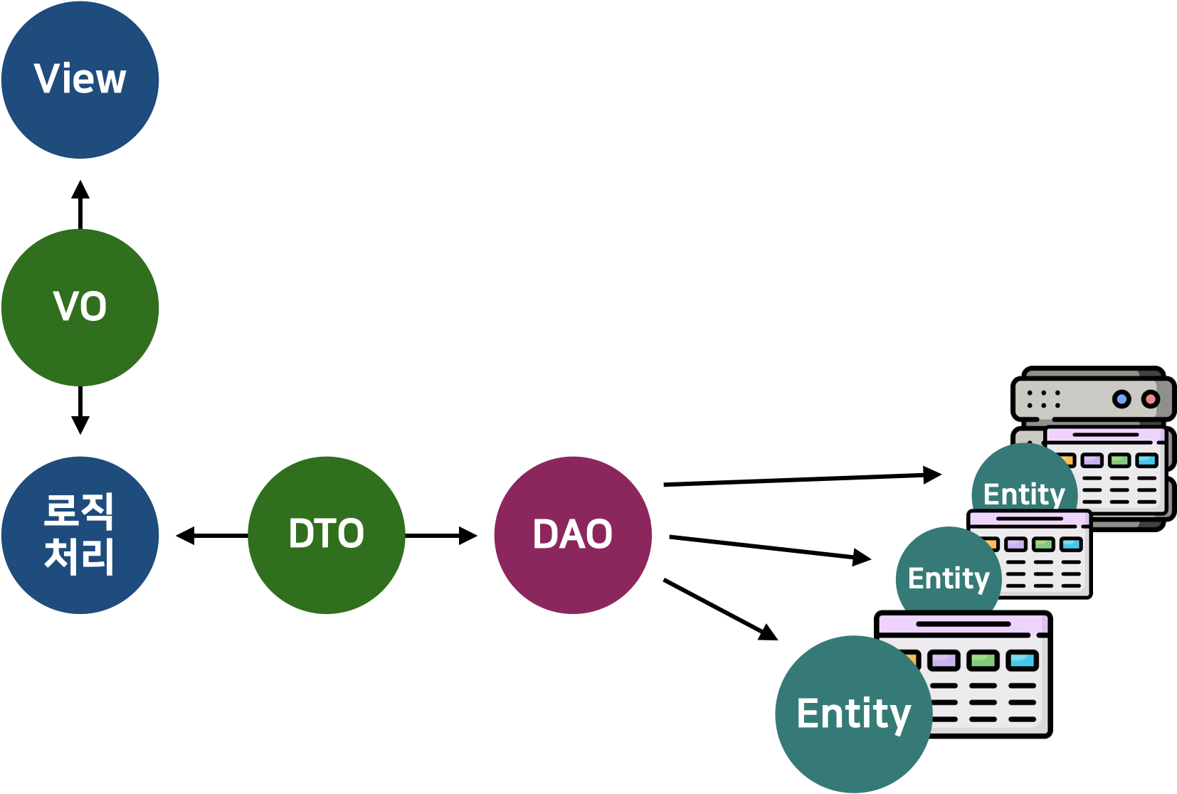 로직 구현이나 데이터 교환을 위해 Entity, DTO, DAO, VO를 사용하게 된다.
