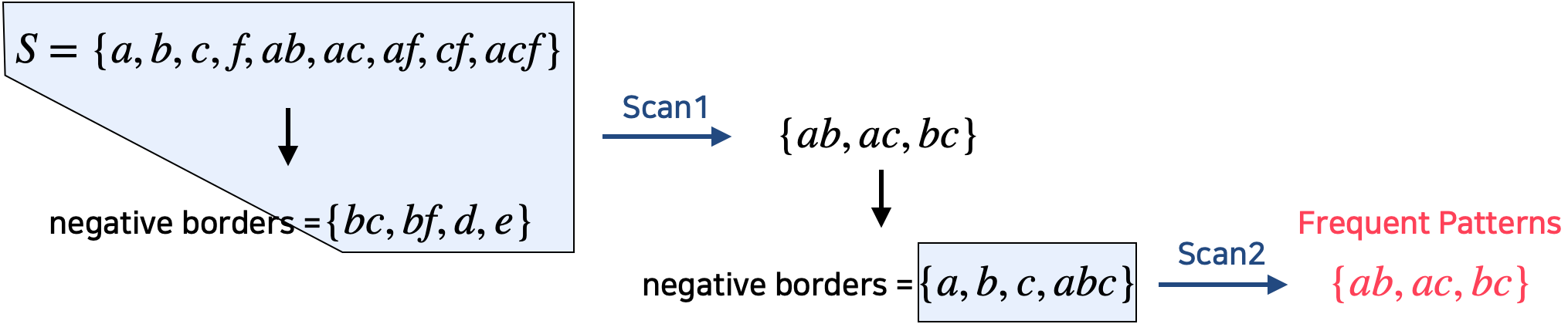 - 위에서 찾아진 frequent pattern들에 대한 negative border를 다시 형성해서 한번 더 테스트한다.