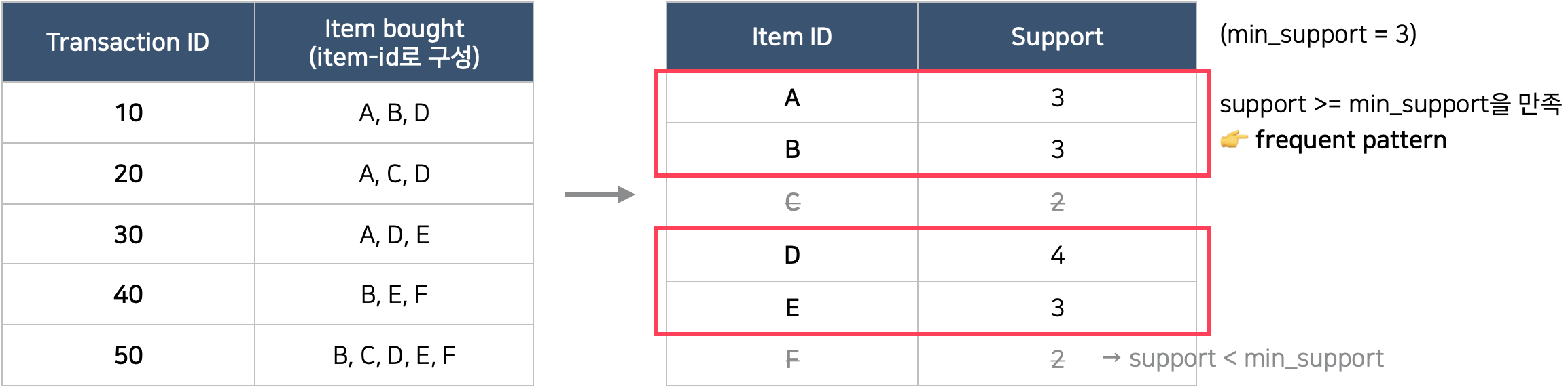 따라서 크기가 1인 frequent pattern은 $\{ A, B, D, E \}$가 된다.