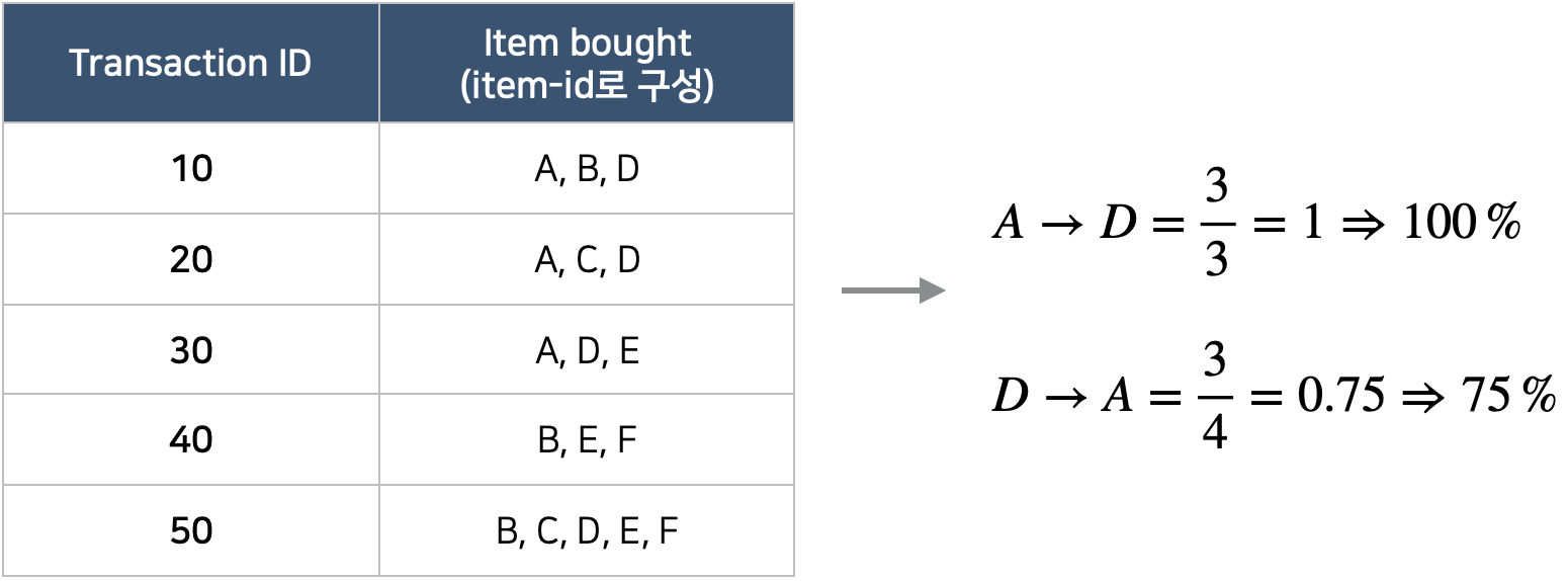 Itemset X와 Y가 있을 때 $X \rightarrow Y$의 X를 살 때 Y도 같이 살 확률이다.