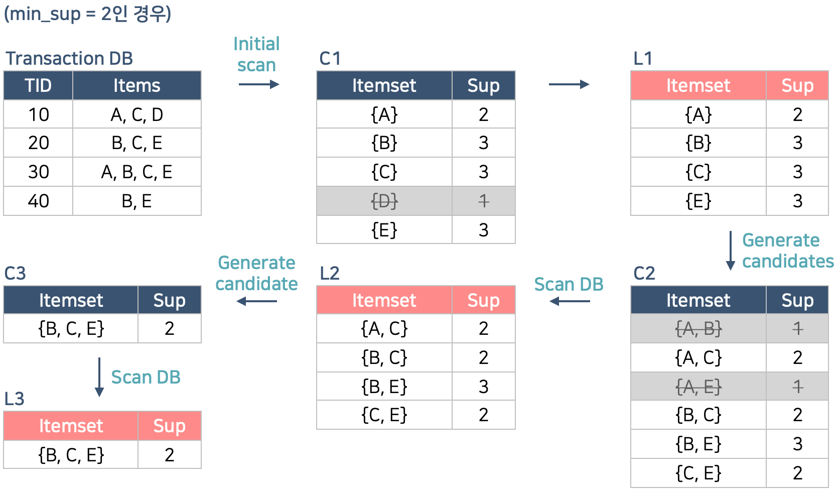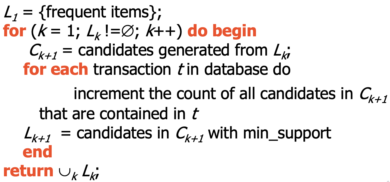 - DB를 scan하며 candidate들을 테스트하고 통과한 itemset을 (k+1)-frequent($L_{k+1}$)로 하여 2를 반복한다.