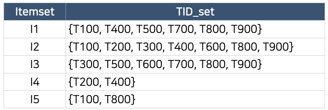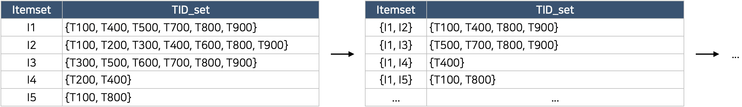 - A와 B를 가지고 있는 transaction = {A를 가진 transactions $\cap$ B를 가진 transactions} $\Rightarrow$ 단순 교집합(intersection)