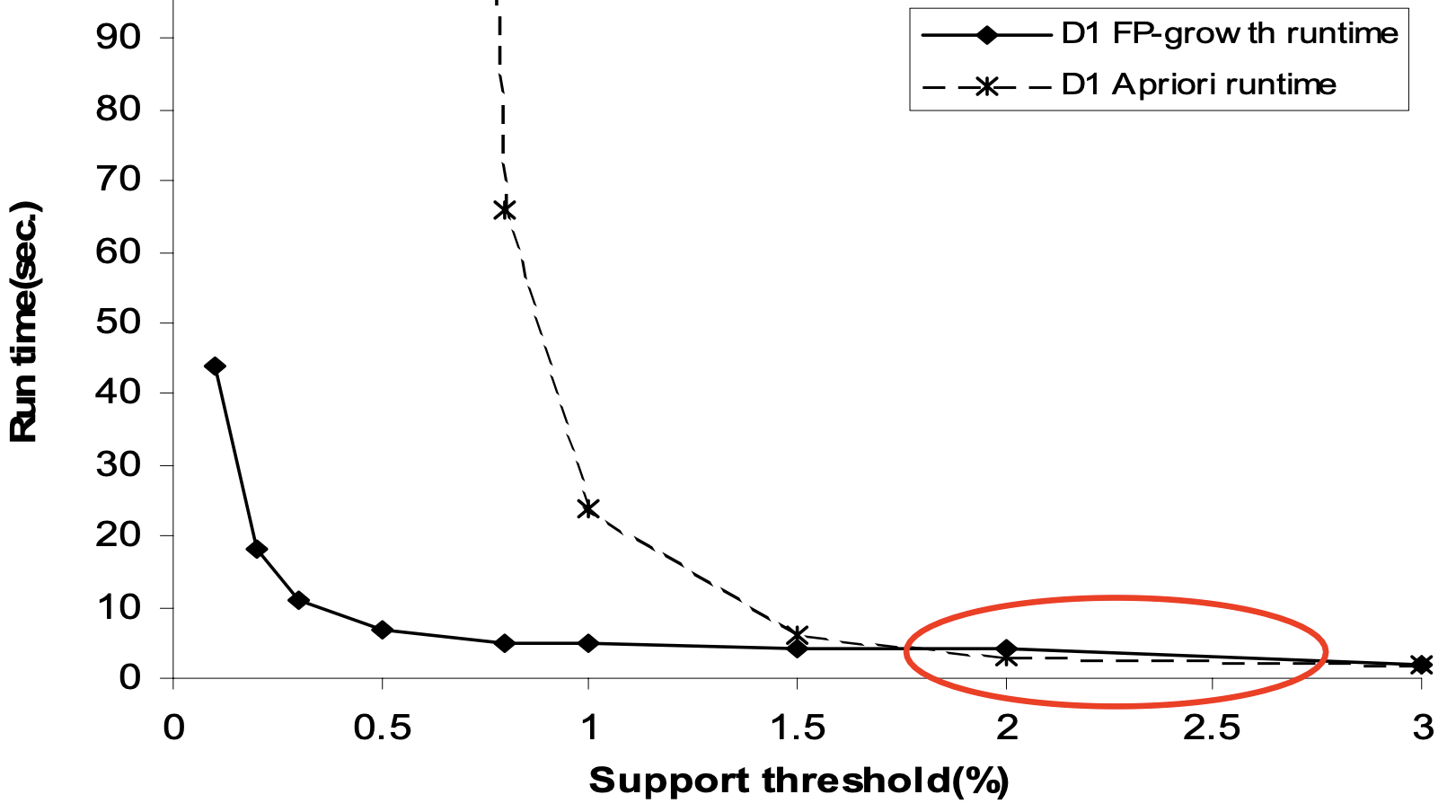 - 반면 FP-growth는 FP-tree를 통해 transaction DB를 compact하게 main memory에 올려서 수행하기 때문에 DB scan 수가 적다.