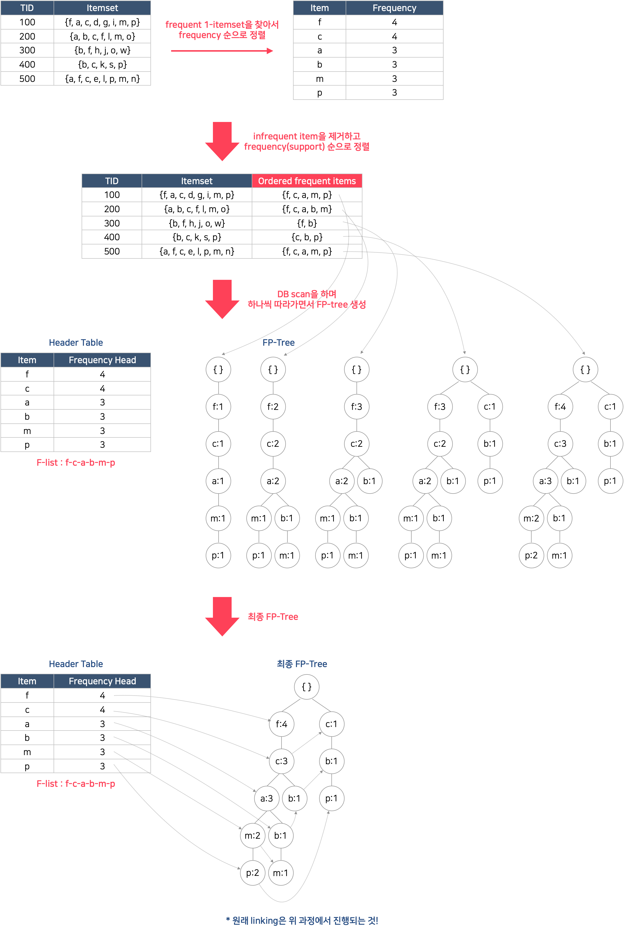 - 정렬된 1-itemset에 따라 DB에서 infrequent item을 제거하고 frequency(support)에 따라 item들을 정렬한다.