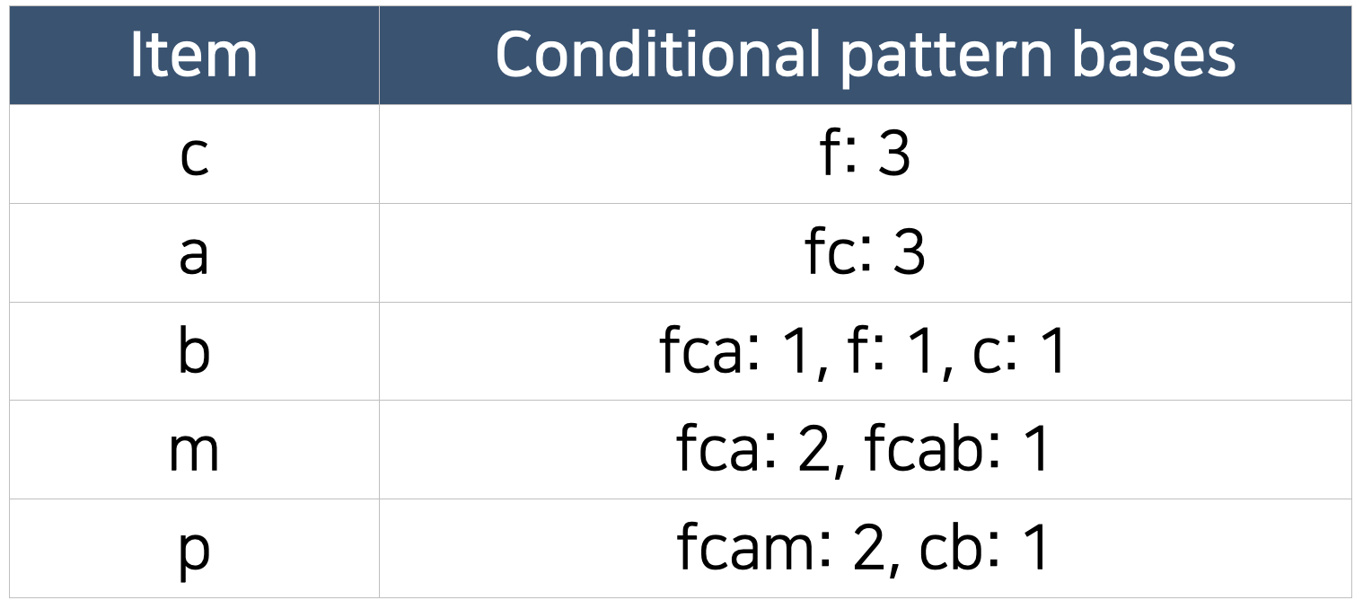위 예제에서 각 item에 대한 conditional pattern은 아래와 같다.