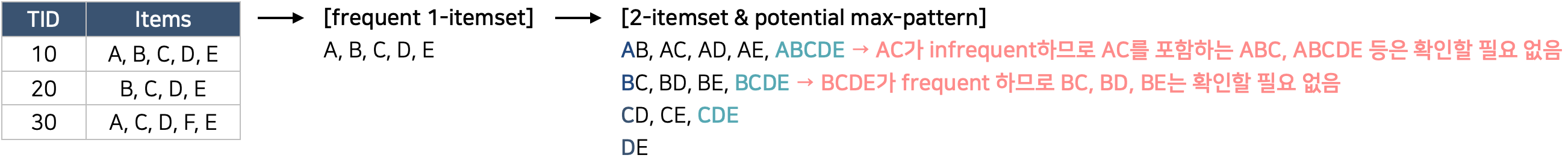 - 2-itemset이 infrequent하다면 그를 포함하는 superset은 확인할 필요 없다. (apriori에서의 downward closure property)