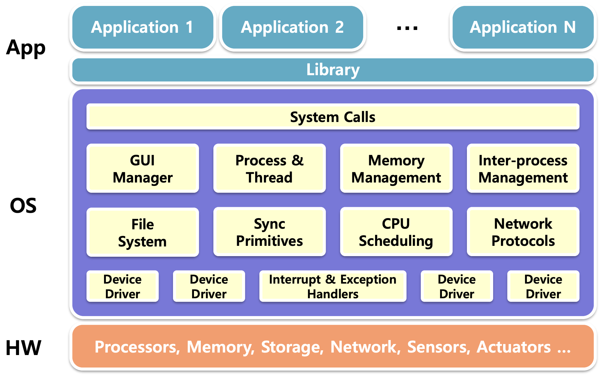 Embedded system의 경우 OS가 없이 hardware와 application으로만 구성되어 있다.