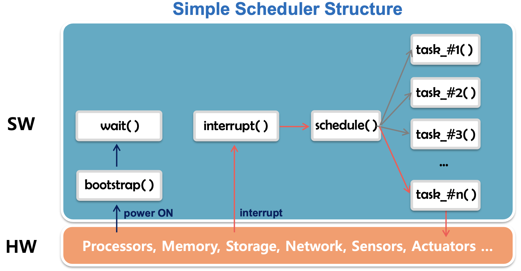 하드웨어에서 전원이 공급된 후 interrupt가 발생하면, 발생한 interrupt에 해당하는 ISR(Interrupt Service Routine) 함수가 실행된다. 이 ISR 함수는 하드웨어의 개수만큼 존재하며, ISR의 기능을 수행하는데 필요한 helper 함수를 호출한다.