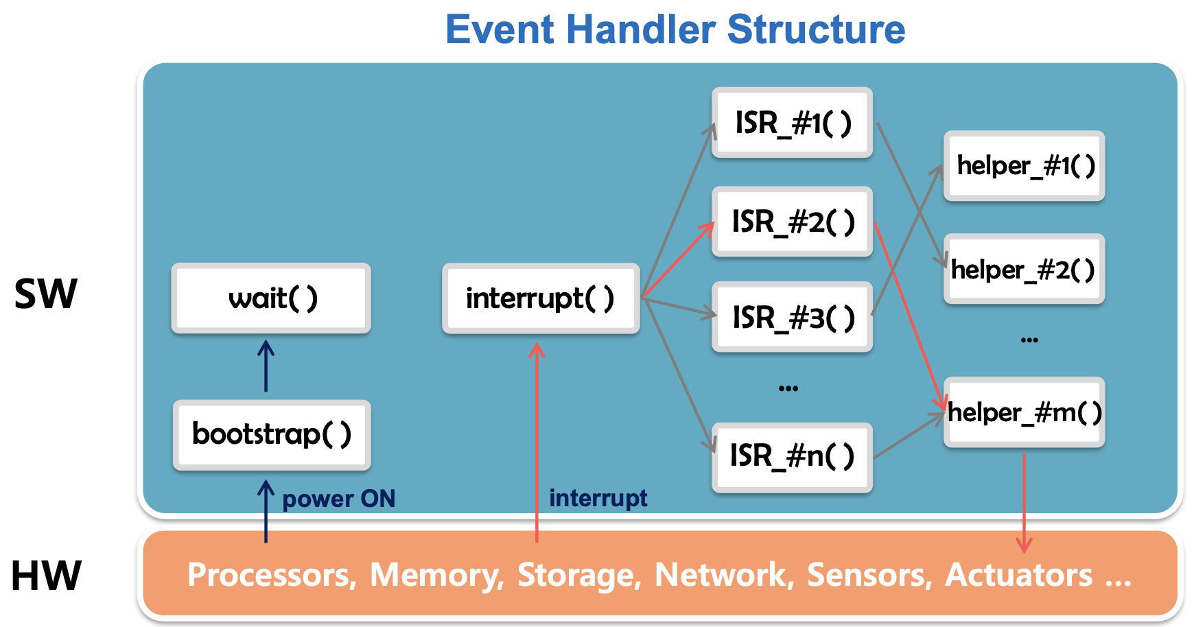 하드웨어에서 전원이 공급된 후 interrupt가 발생하면, 발생한 interrupt에 해당하는 ISR(Interrupt Service Routine) 함수가 실행된다. 이 ISR 함수는 하드웨어의 개수만큼 존재하며, ISR의 기능을 수행하는데 필요한 helper 함수를 호출한다.