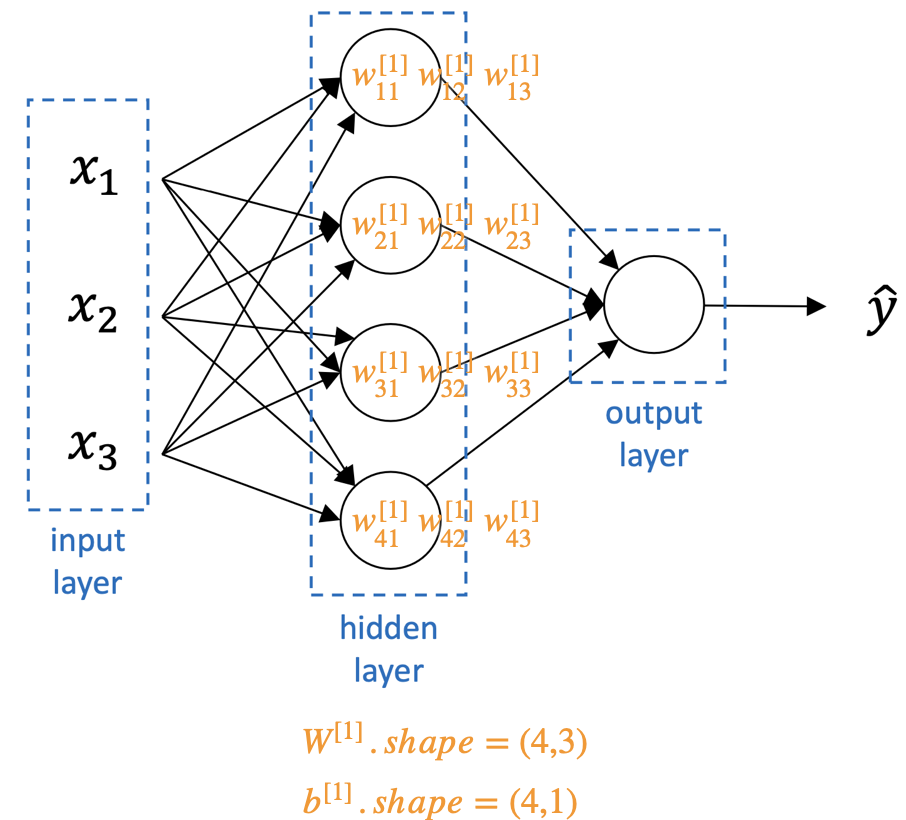아래 모델에서 input layer의 변수는 3개이므로 하나의 unit당 3개의 w를 가지고 1st layer은 4개의 unit으로 구성되어있으므로 $W^{[1]}$의 shape은 $(4, 3)$이다.