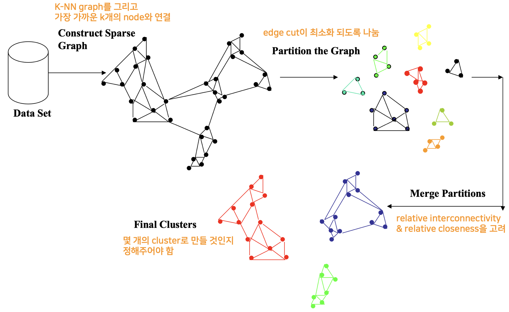 두 cluster 간 interconnectivity와 closeness가 상대적으로 크면 두 cluster를 merge한다.