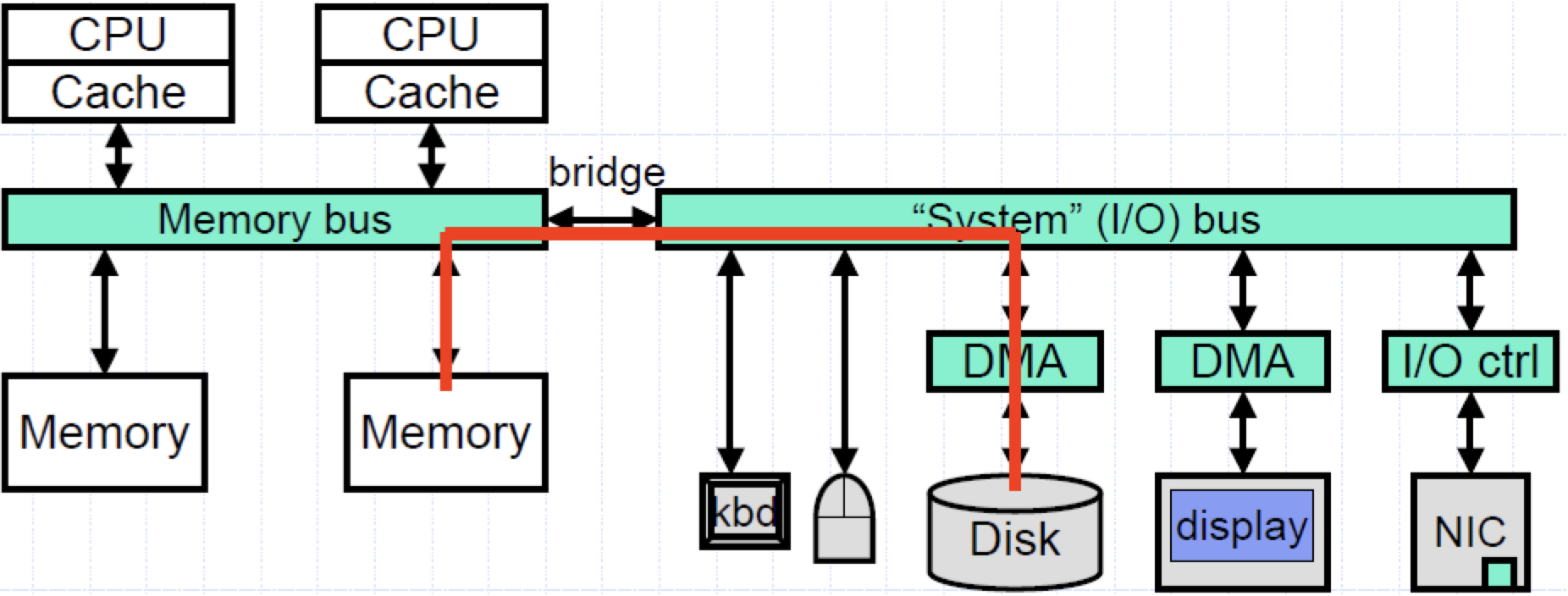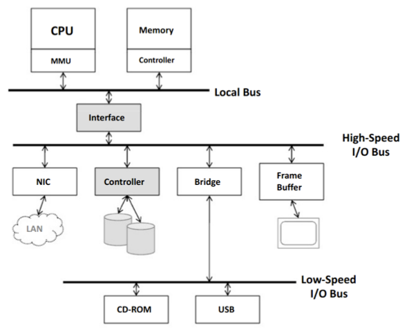 High-speed I/O bus와 low-speed I/O bus는 bridge로 연결되어있다.
