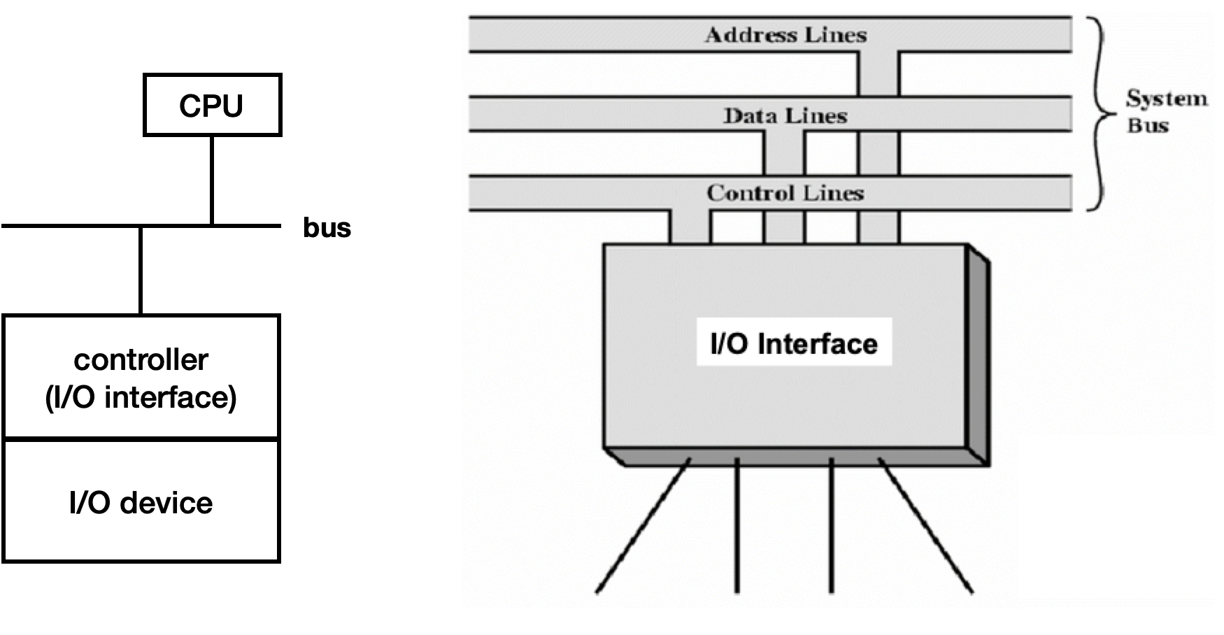 - interrupt (interrupt driven I/O) : device가 필요한 작업이 발생하면 CPU에 interrupt를 발생시킨다.
