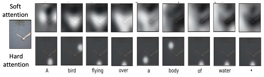 Hard attention은 하나의 region만 보는 반면, soft attention은 여러 region을 보는 것을 확인할 수 있다.