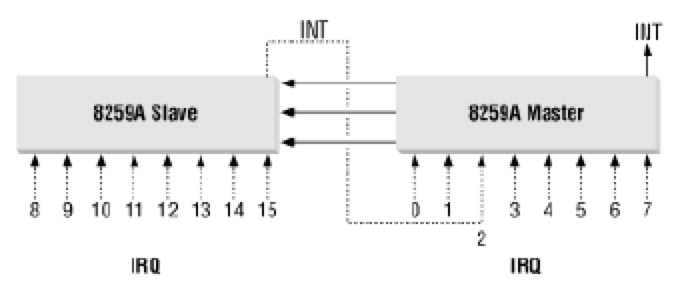 그러나 보통 8개 만으로는 모든 I/O 장치들을 연결할 수 없기 때문에 8259A 여러개를 직렬로 연결해서 사용한다.
