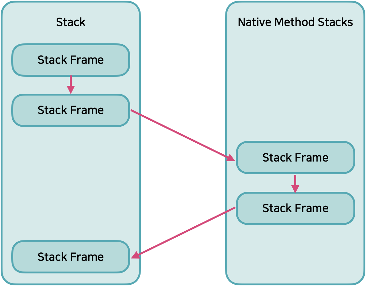 - JVM stack과 native method stacks이 나뉘어져있지만, dynamic linking을 통해 확장될 뿐이다.
