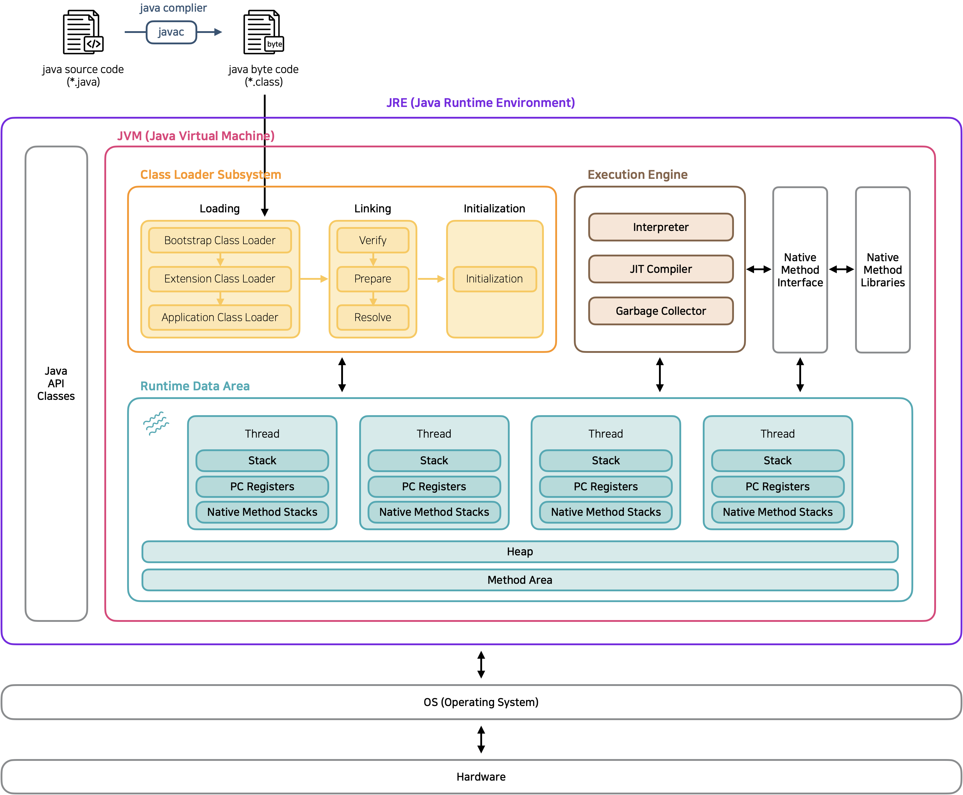 - 인터프리터 방식 : JVM은 변환된 소스코드를 런타임에 읽어서 코드를 실행한다.