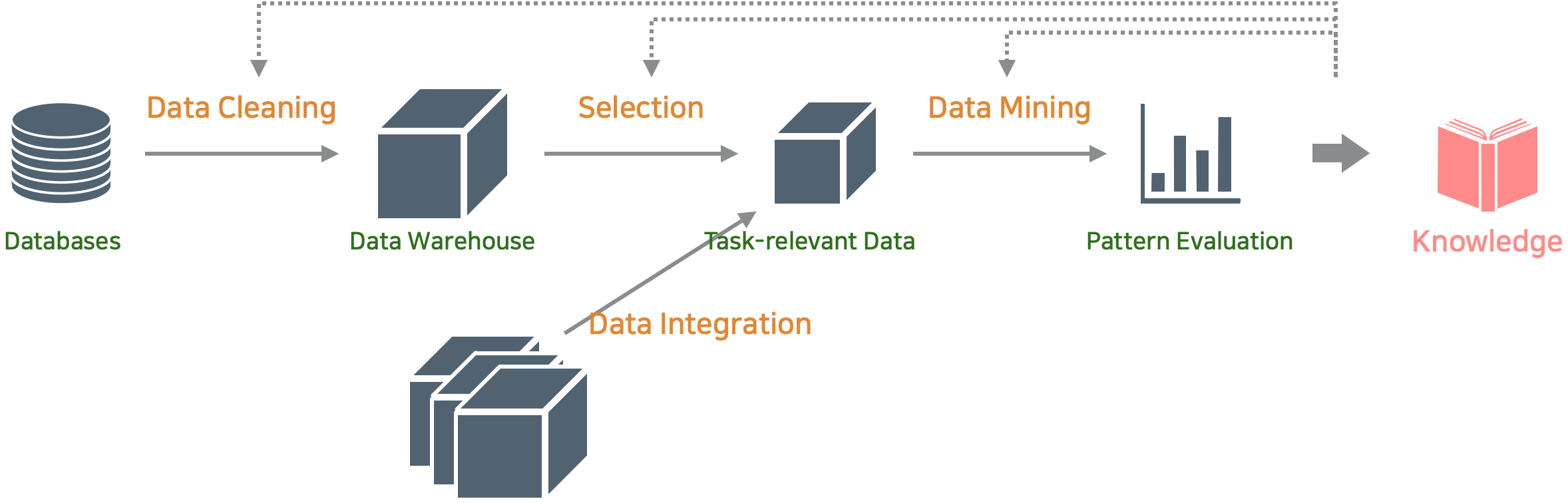- 이 데이터들 중에서 data mining을 통해 의미있는 pattern을 추출해내는데 이 과정을 좁은 의미의 data mining이라 한다.