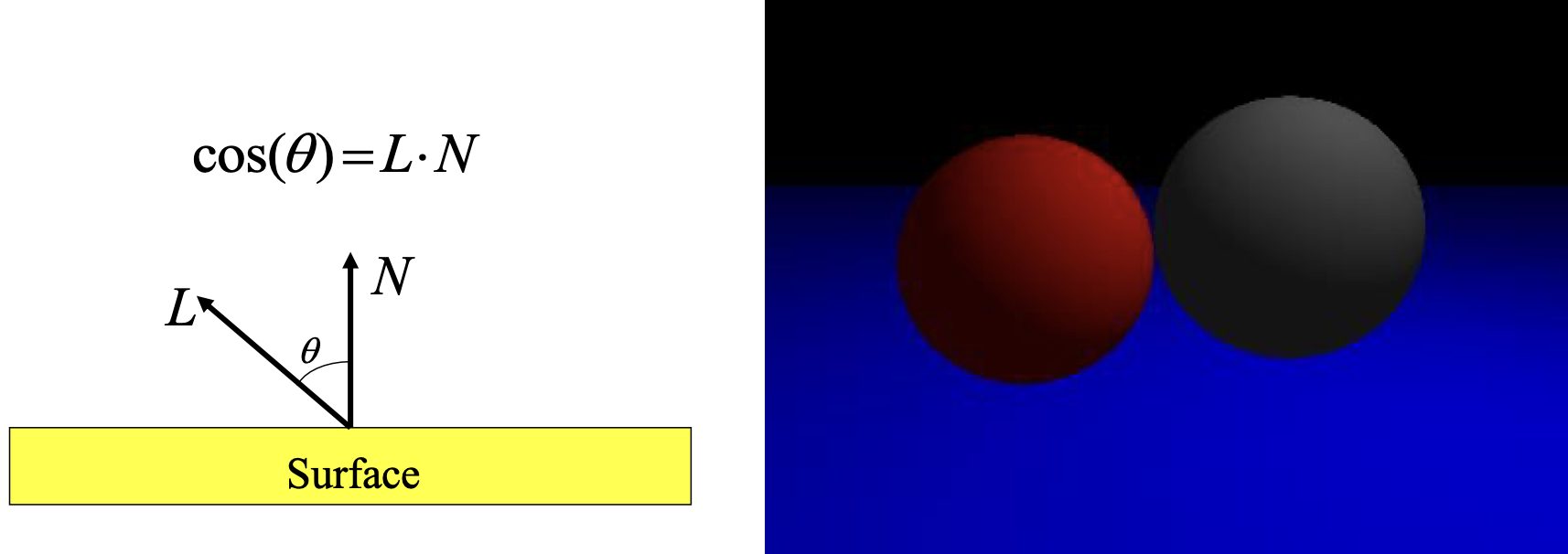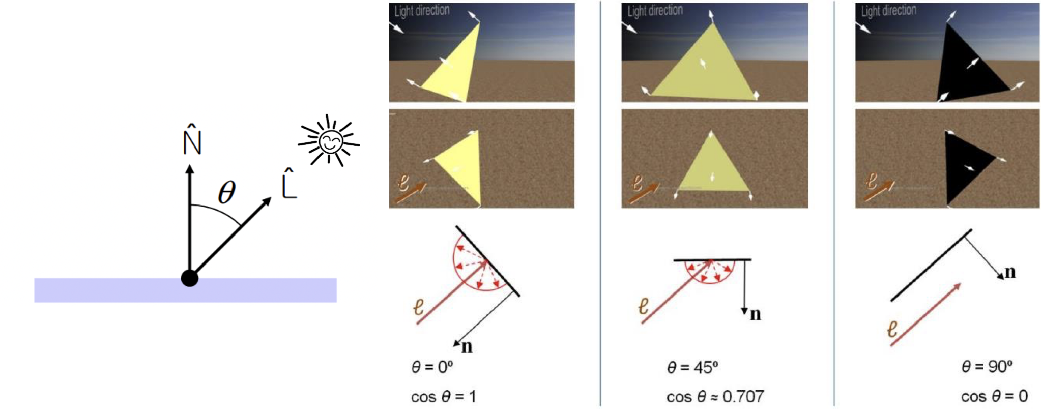$I_{reflected} = I_{incident} cos \theta = I_{incident} (\hat{N} \cdot \hat{L})$