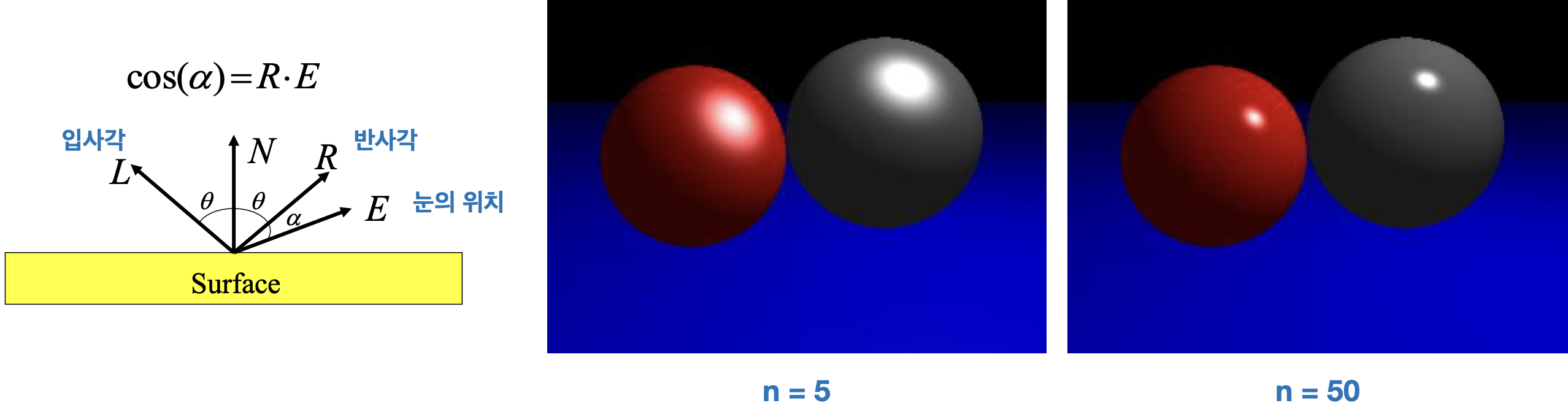 $\alpha$ : 반사광(R)과 눈(E) 사이의 각도